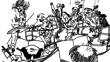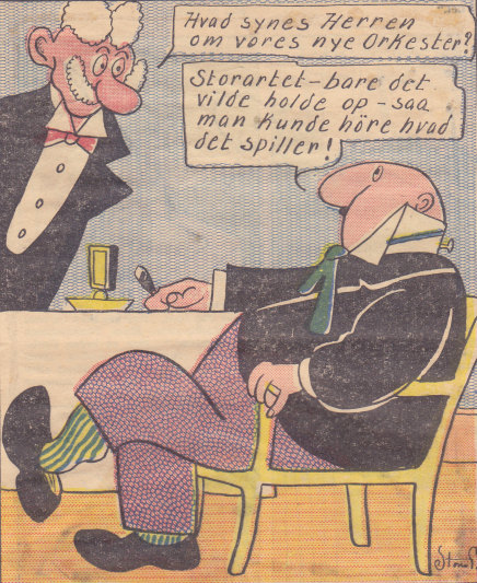 Under en orkesterprøve råber dirigenten: "2. trompet er for kraftig". 1. trompeten svarer: "Ja, men han er slet ikke kommet endnu"..."så sig det til ham når han kommer".